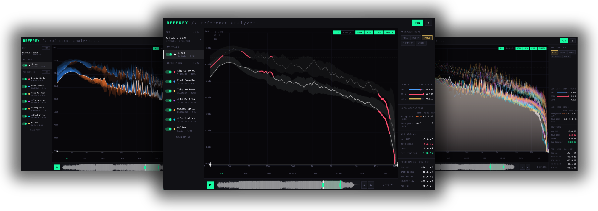 ELEMENTS mode gives you the finest level of detail available… maybe ever. Identify exactly where certain elements like sub, kick, snare, leads, vocals, etc. sit in your references, and adjust yours to match.